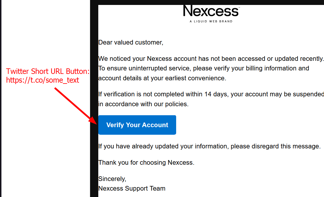 The email content is as basic as it may sound, just some text to scare you enough to click the button and open the url.